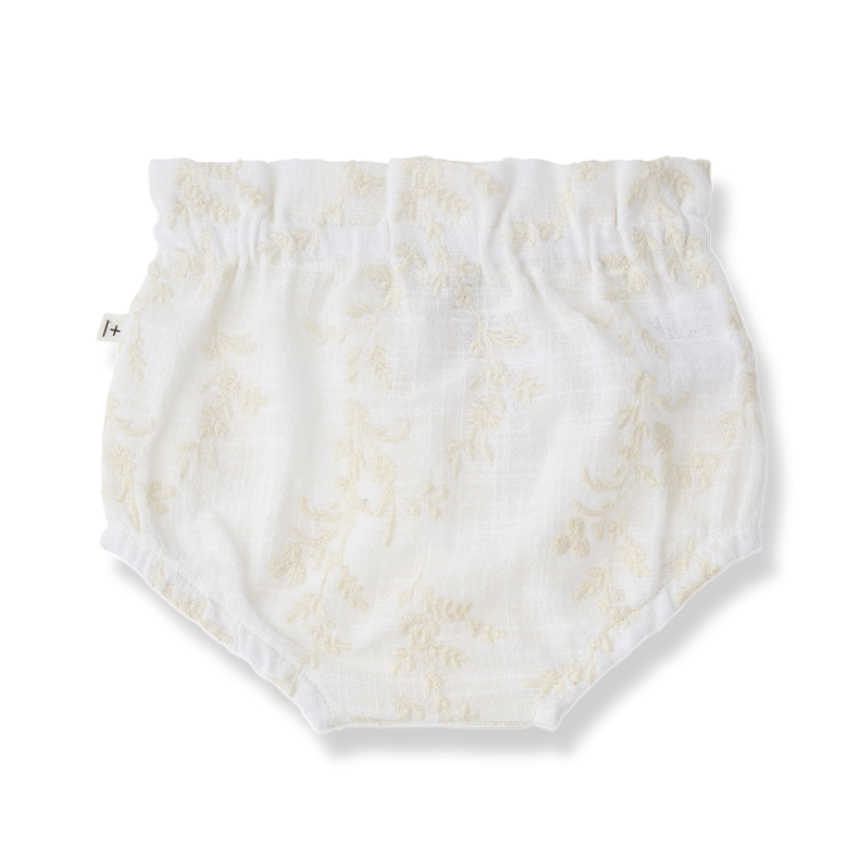 Este bloomer para bebé está confeccionado en tejido ligero de algodón en tono crudo, con un delicado estampado floral en colores suaves que aporta un estilo romántico y natural. Su diseño está pensado para ofrecer máxima comodidad, ideal para los días más cálidos.