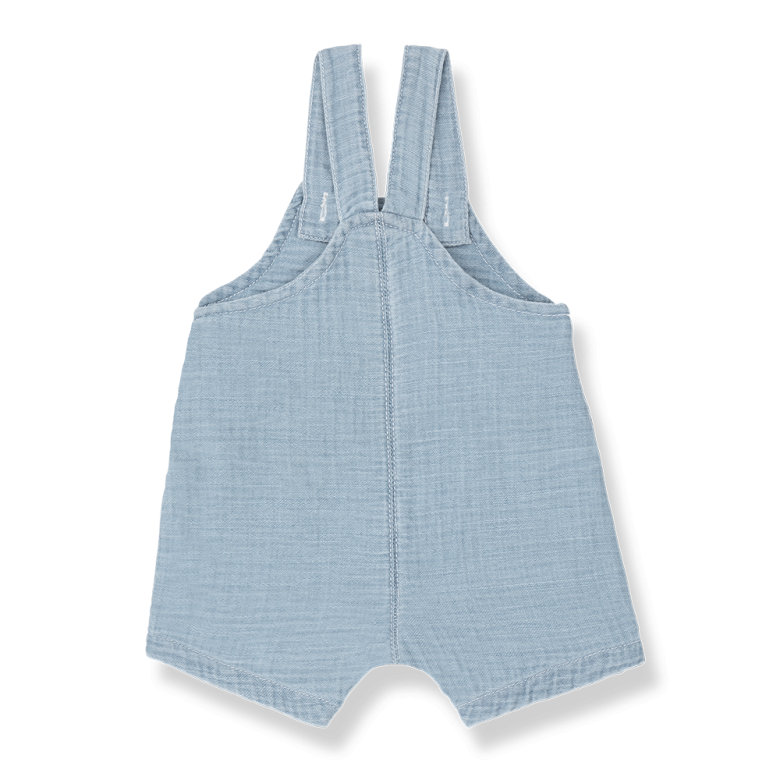 Este mono corto para bebé está confeccionado en tejido denim soft de color azul claro, suave, ligero y muy cómodo, ideal para el día a día en épocas cálidas. Presenta un diseño tipo peto, con tirantes anchos que se ajustan mediante botones de madera en la parte frontal, aportando un estilo natural y atemporal.