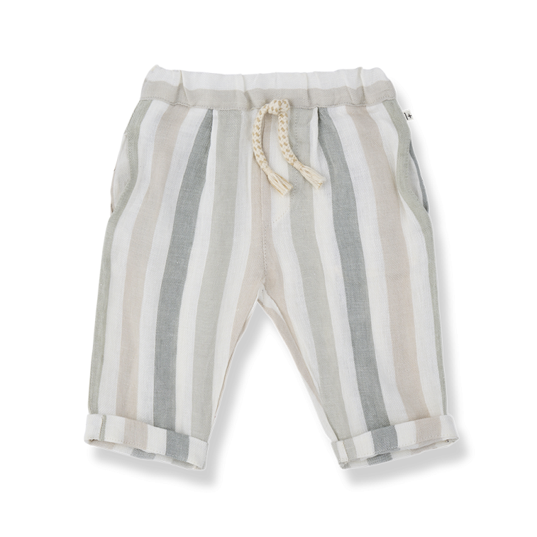 Pantalón infantil confeccionado en un tejido ligero y suave con estampado de rayas verticales en tonos neutros beige, blanco y gris. Presenta un diseño cómodo y relajado, ideal para el día a día del bebé.