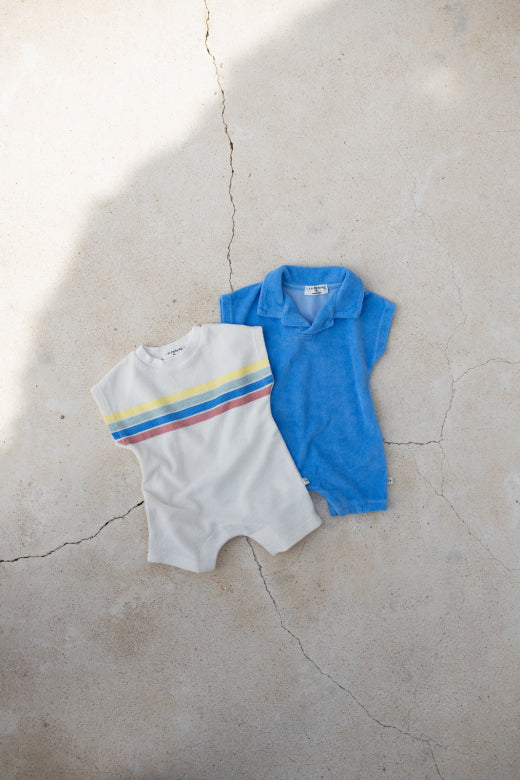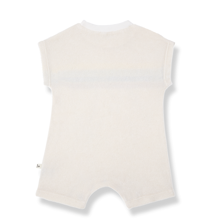 Pelele para bebé en tono off-white, confeccionado en un tejido suave y agradable al tacto, ideal para la piel delicada. Presenta un diseño sin mangas y cuello redondo con acabado acanalado para un ajuste cómodo. En la parte frontal destaca una franja horizontal multicolor en tonos suaves (amarillo, verde agua, azul y rosa), que aporta un toque alegre y moderno.