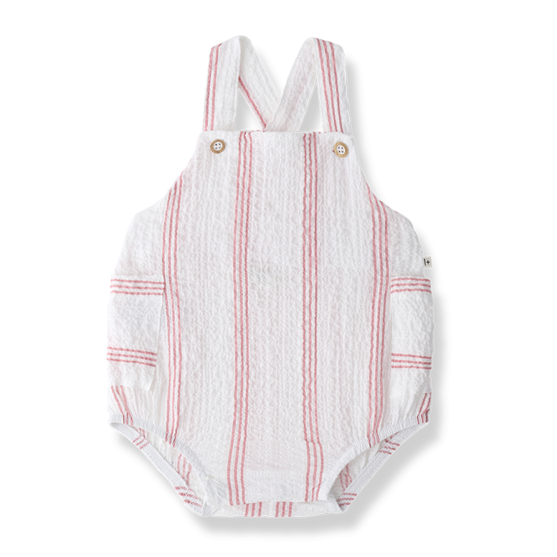 Tiene tirantes anchos cruzados en la espalda, que aseguran una buena sujeción y añaden un detalle encantador al diseño. En la parte frontal incorpora botones de madera, que facilitan el vestir y aportan un toque natural. Las aberturas de las piernas cuentan con acabado elástico suave, pensado para ofrecer comodidad y libertad de movimiento al bebé.