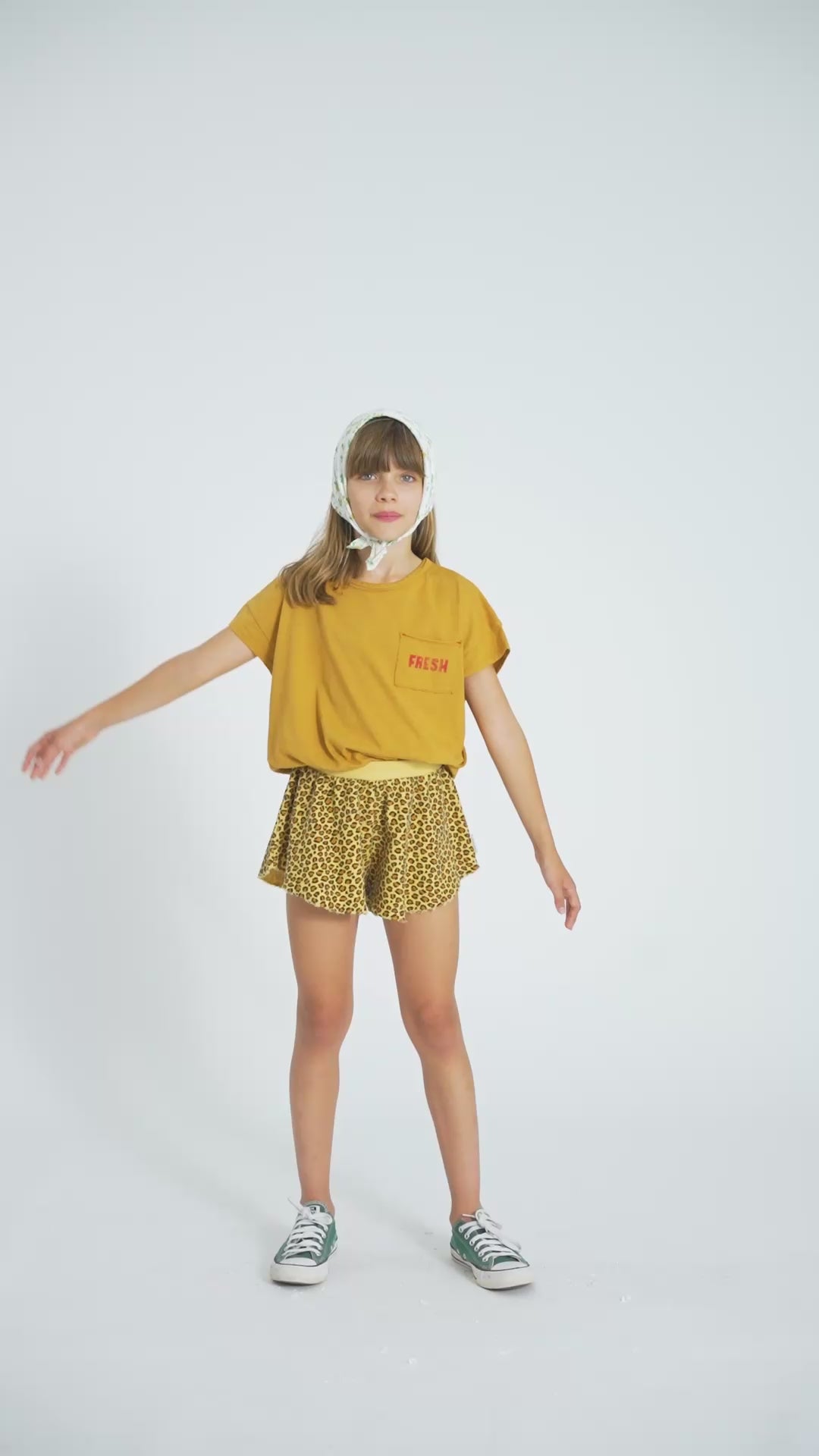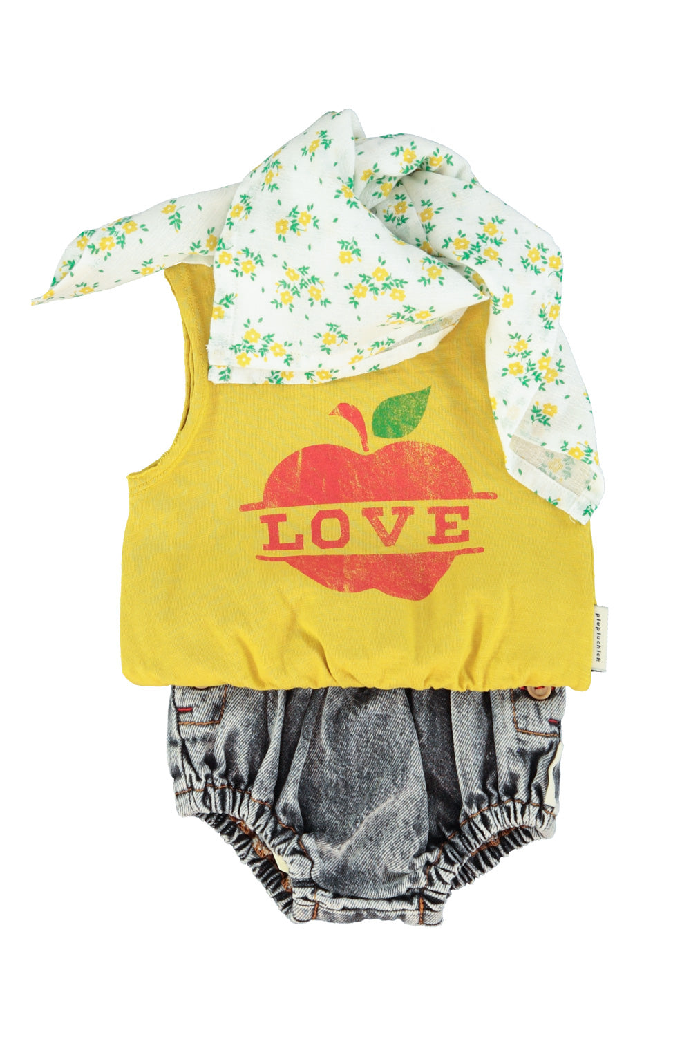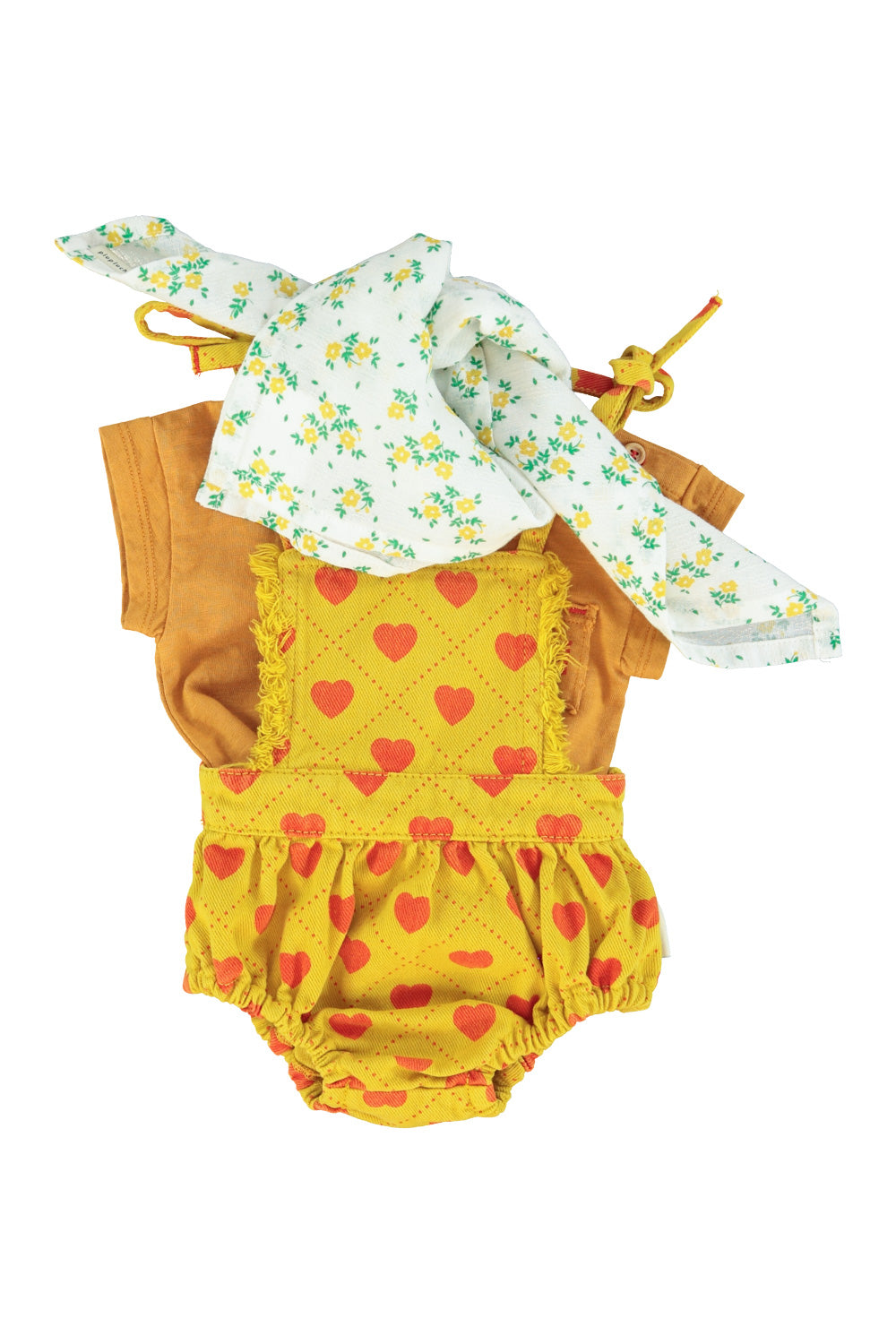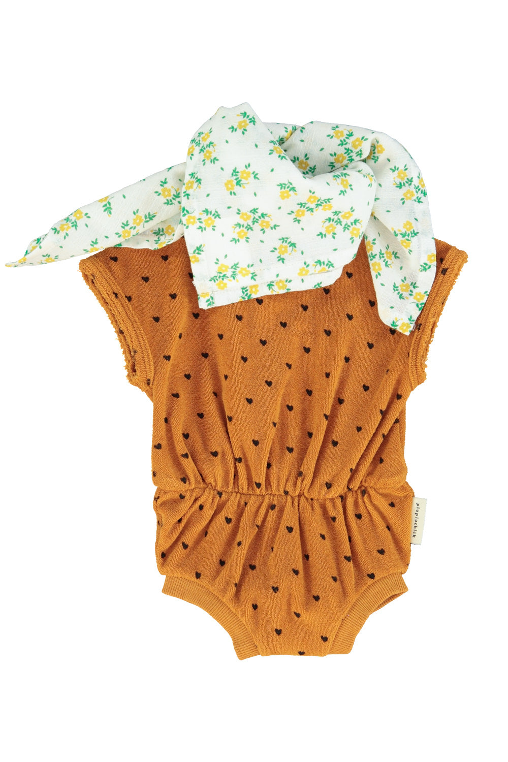 La bandana de la marca Piupiuchick es de tejido ligero y suave, en color ecru, con un pequeño estampado floral distribuido por toda la superficie. Las flores son de tamaño pequeño, en tonos amarillos con detalles en verde, lo que le da un aire delicado y natural. Tiene un acabado fluido y se puede anudar fácilmente, funcionando como un complemento fresco y decorativo que aporta un toque alegre y veraniego al conjunto.