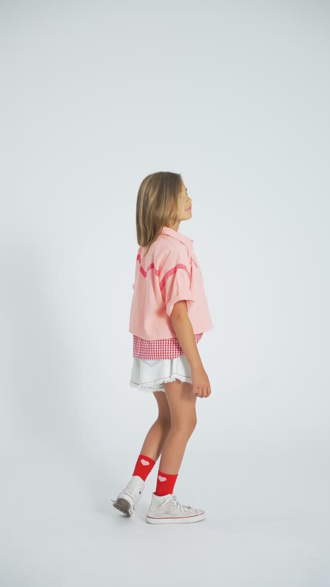 La blusa de la marca Piupiuchick es de manga corta y está confeccionada en un tejido ligero y fresco. Presenta un estampado de cuadros vichy en rojo y ecru, de inspiración clásica y veraniega. Tiene un corte recto y cómodo, con un escote redondeado sencillo. En la parte frontal destaca una botonadura central con pequeños botones en tono natural, que aportan un detalle delicado y funcional. El acabado es limpio y desenfadado, ideal para combinar con faldas, shorts o pantalones y crear looks frescos y cómodos