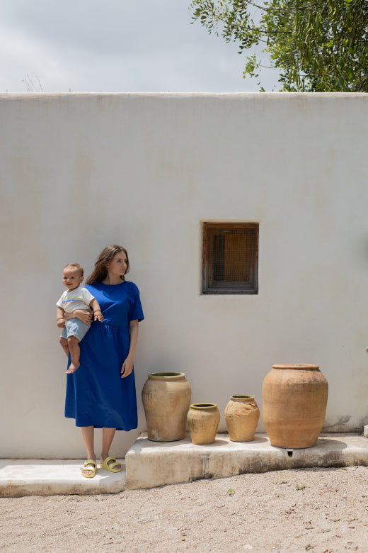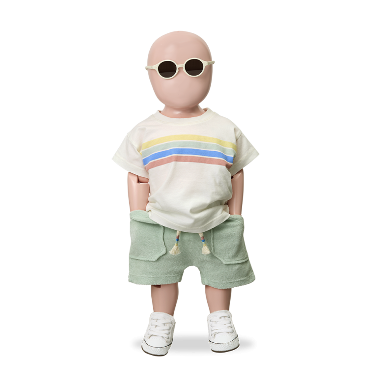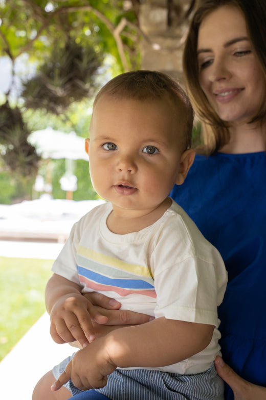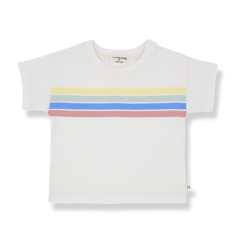 El detalle protagonista es la franja horizontal multicolor en el pecho, compuesta por líneas en tonos amarillo, verde suave, azul y rosa, que le dan un aire fresco y veraniego. El corte es recto y relajado, pensado para facilitar el movimiento y el uso diario.
