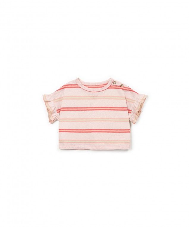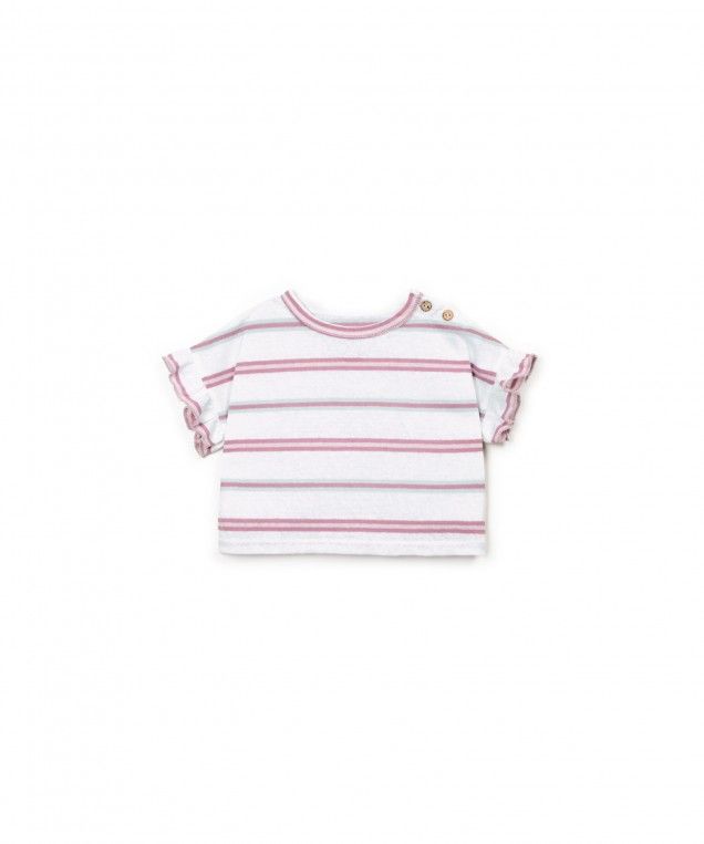 Presenta cuello redondo y manga corta con delicado acabado fruncido, un detalle que aporta un toque dulce y femenino a la prenda. En el hombro incorpora botones de madera, característicos de la marca, que facilitan el momento de vestir y desvestir al bebé.