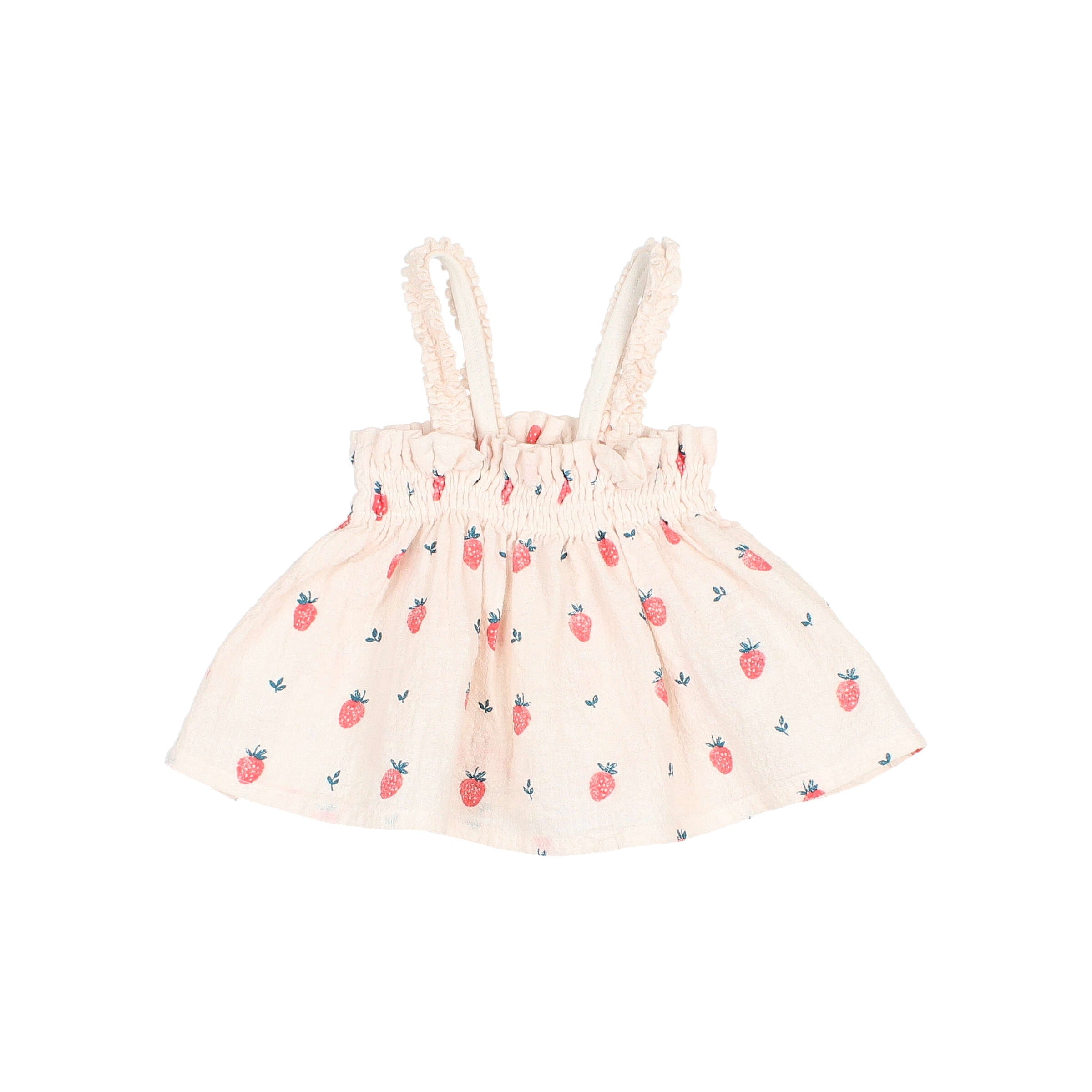 El top es de color cream pink, con un estampado delicado de pequeñas fresas en tonos rosa coral y verde, que le da un aire dulce y muy veraniego. El diseño es ligero y encantador, pensado especialmente para los días de calor.