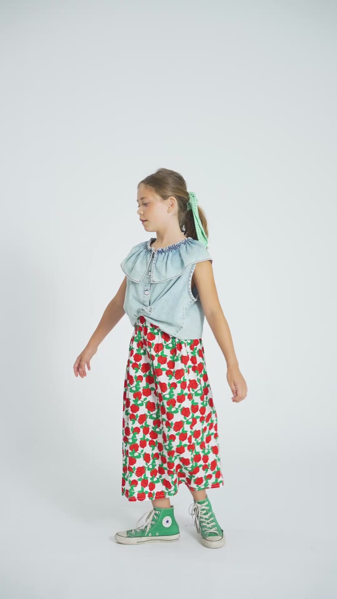 La blusa de la marca Piupiuchick está confeccionada en denim ligero de lavado claro, con un tacto suave y un acabado fresco. Presenta un diseño sin mangas y un amplio cuello tipo volante fruncido que rodea el escote, aportando volumen y un aire delicado. El frontal cuenta con una pequeña botonadura central con botones decorativos, y en la parte inferior incorpora un nudo que permite ajustar ligeramente la prenda y añade un detalle desenfadado. Las costuras en contraste resaltan los acabados y refuerzan su carácter casual. Es una blusa cómoda y versátil, con un equilibrio entre estilo romántico y look informal.