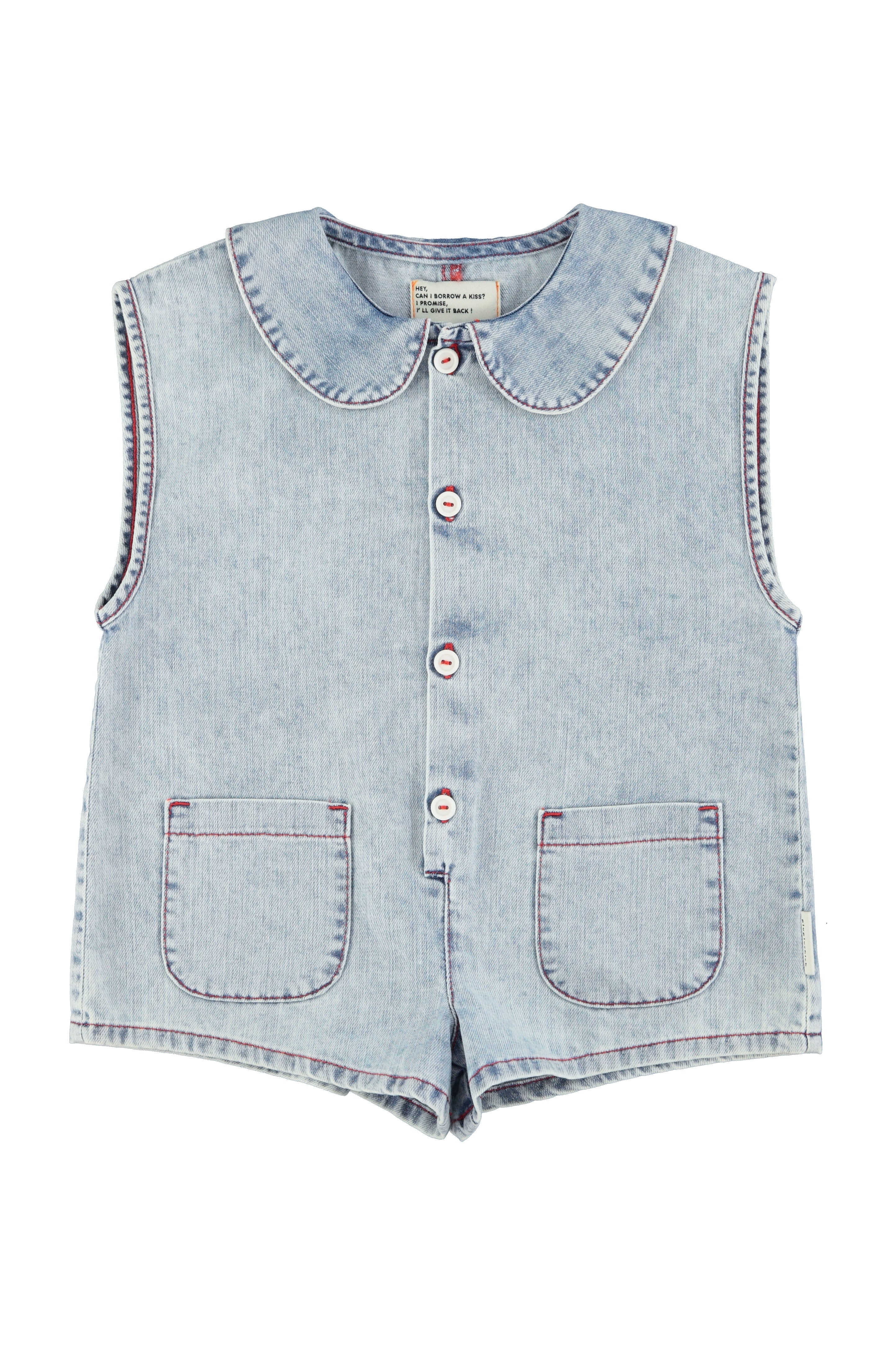 Es un mono corto de denim claro de la marca Piupiuchick con un aire fresco y retro. Tiene un corte recto y holgado, ideal para verano. La parte superior es sin mangas, con hombros ligeramente estructurados y un cuello redondeado tipo Peter Pan, que le da un toque clásico y delicado.