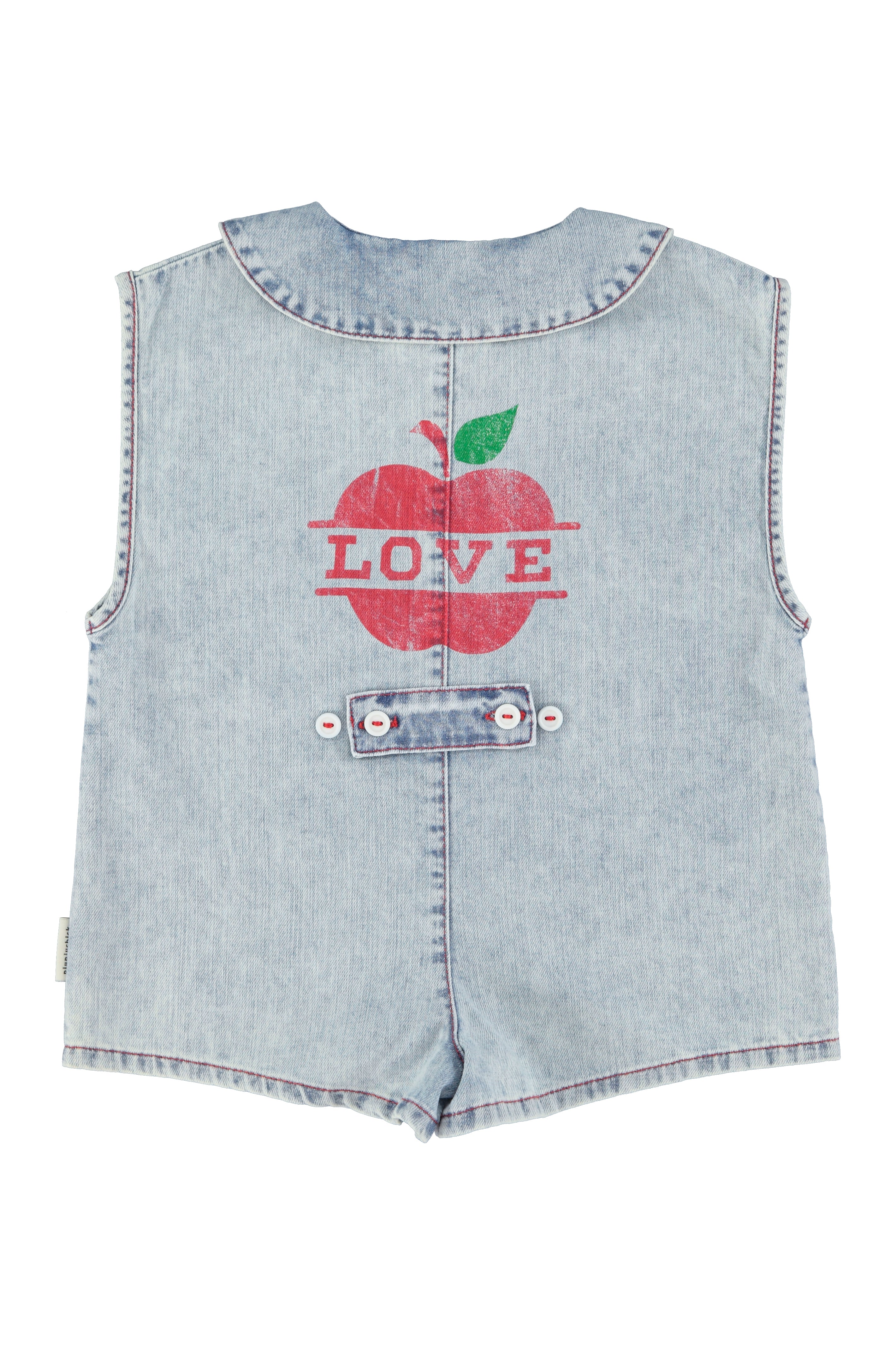 En la espalda destaca un estampado grande de manzana con la palabra “LOVE”, de efecto ligeramente desgastado, que aporta personalidad y un punto divertido. Incluye además un pequeño detalle decorativo en la parte baja de la espalda, también con botones.