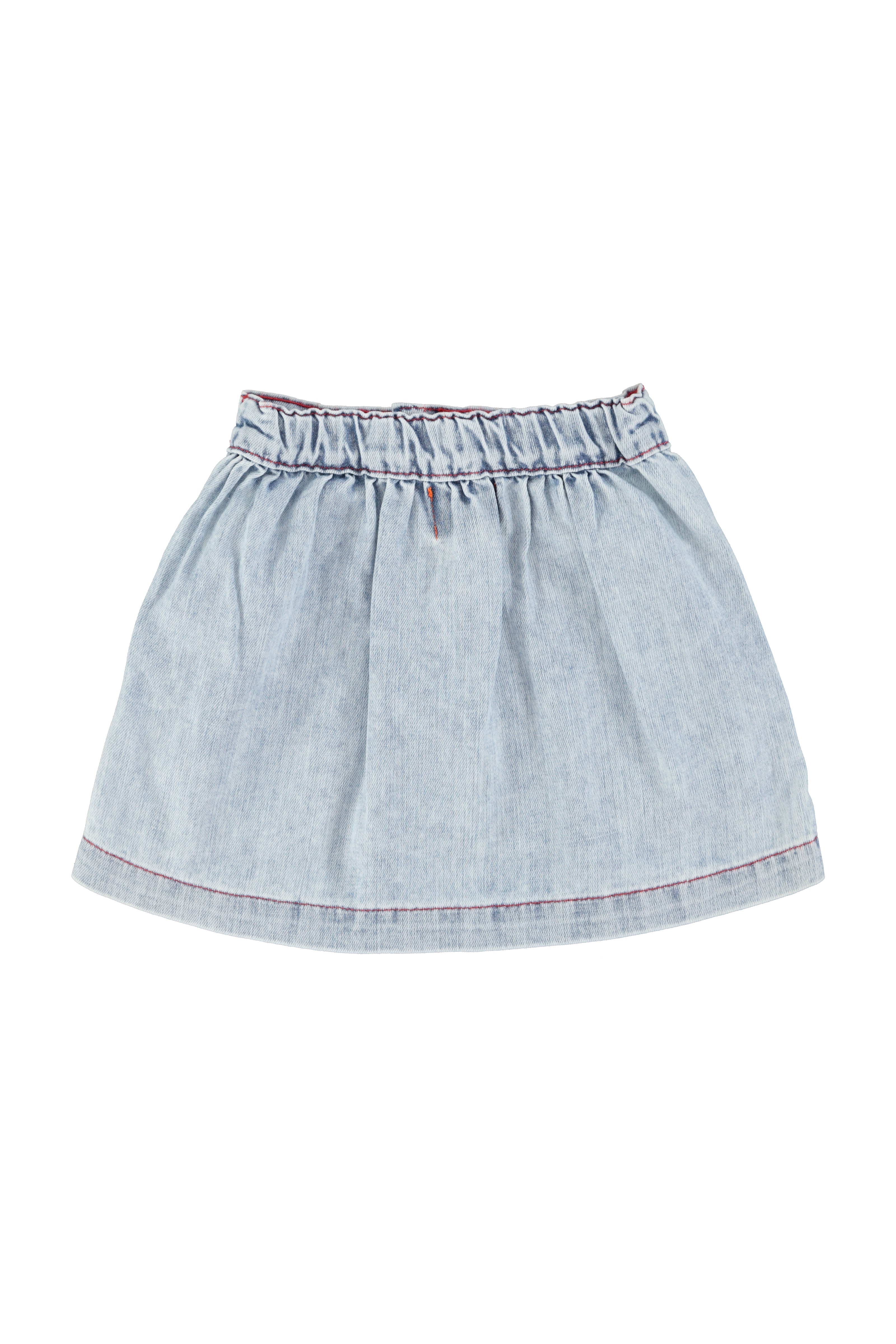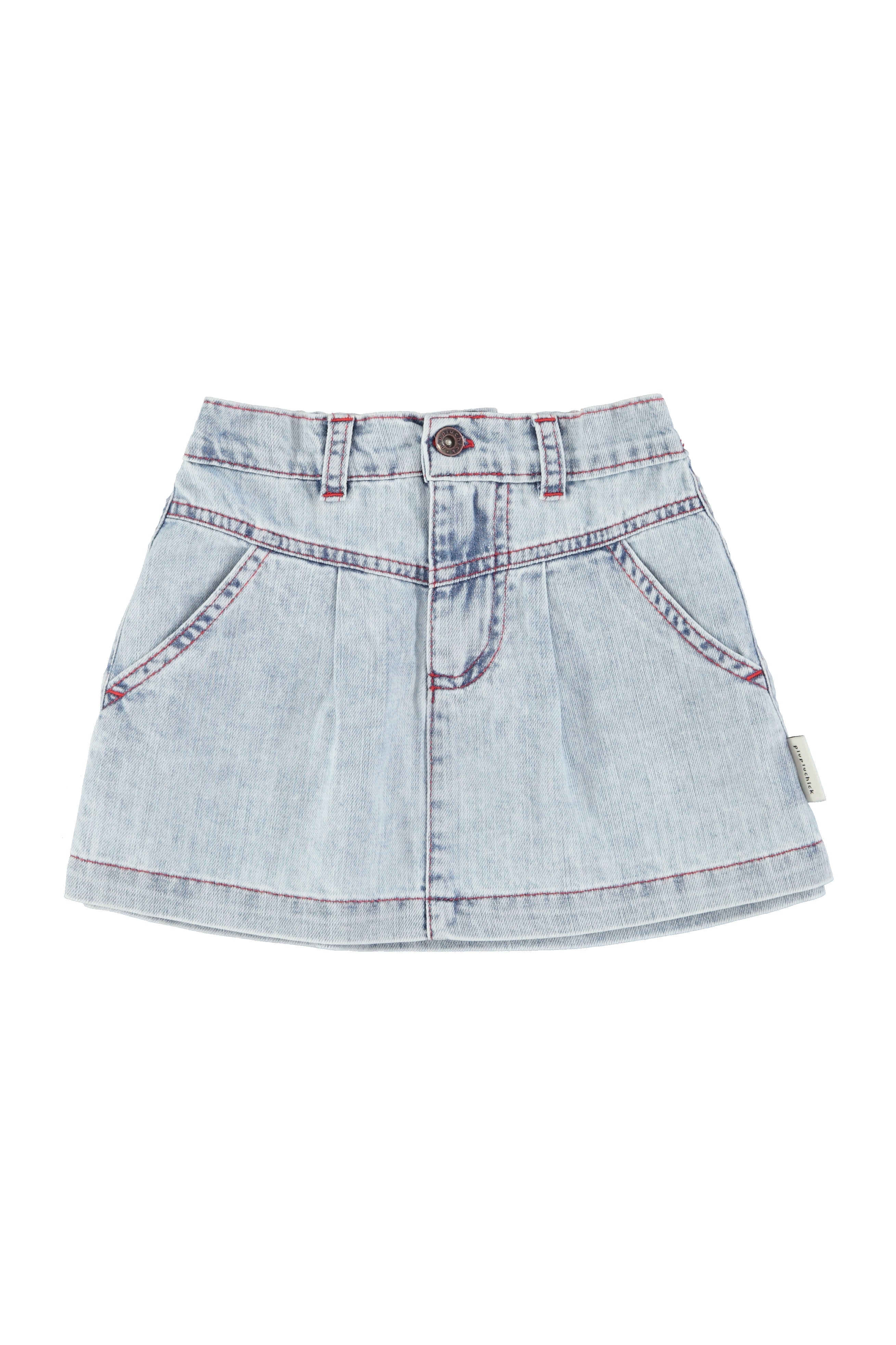Es una falda corta de denim claro de la marca Piupiuchick, con un acabado lavado suave que le da un aspecto fresco y casual. Tiene un corte recto y estructura tipo vaquera, pensada para ser cómoda y fácil de combinar.