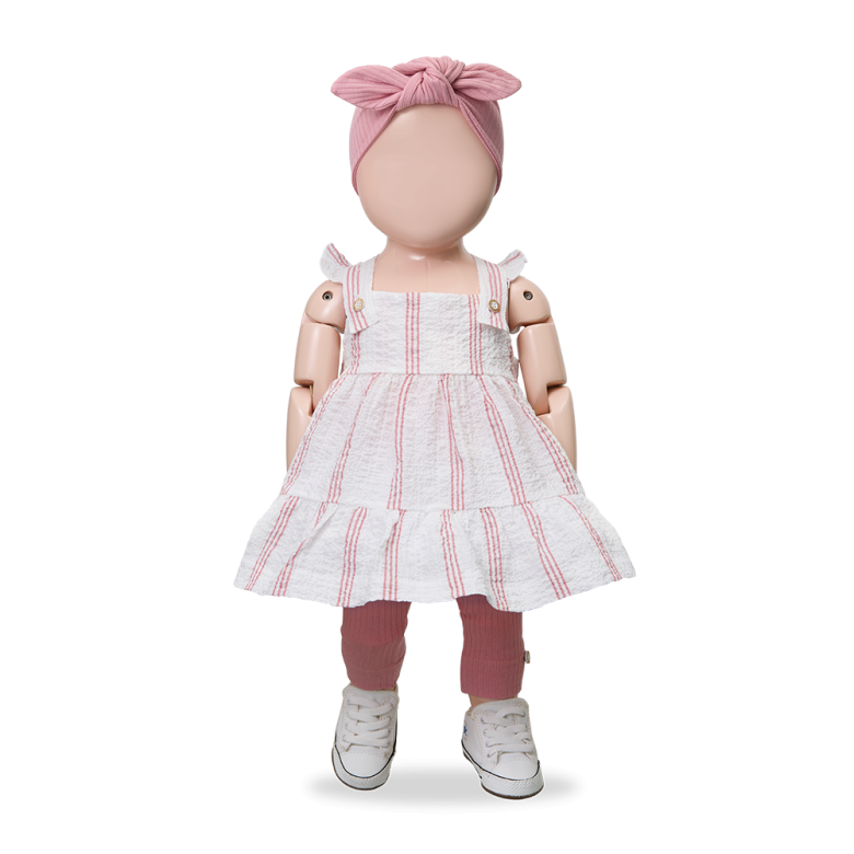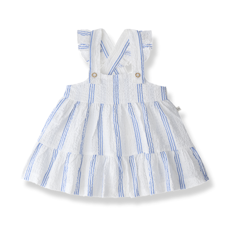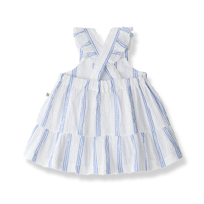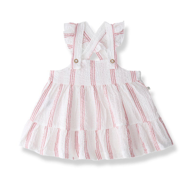 Presenta un fondo blanco con delicadas rayas verticales, que le dan un aire dulce y atemporal. El diseño cuenta con tirantes anchos cruzados en la espalda, ajustados con botones, lo que aporta un toque artesanal y facilita el ajuste.