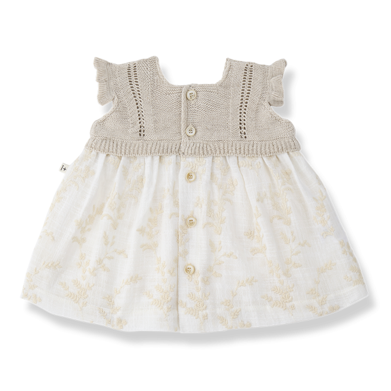 Es una prenda de estilo romántico, natural y elegante, ideal para ocasiones especiales o para un look cuidado en el día a día. Un vestido delicado y cómodo, fiel al estilo refinado y artesanal de 1+ in the family.