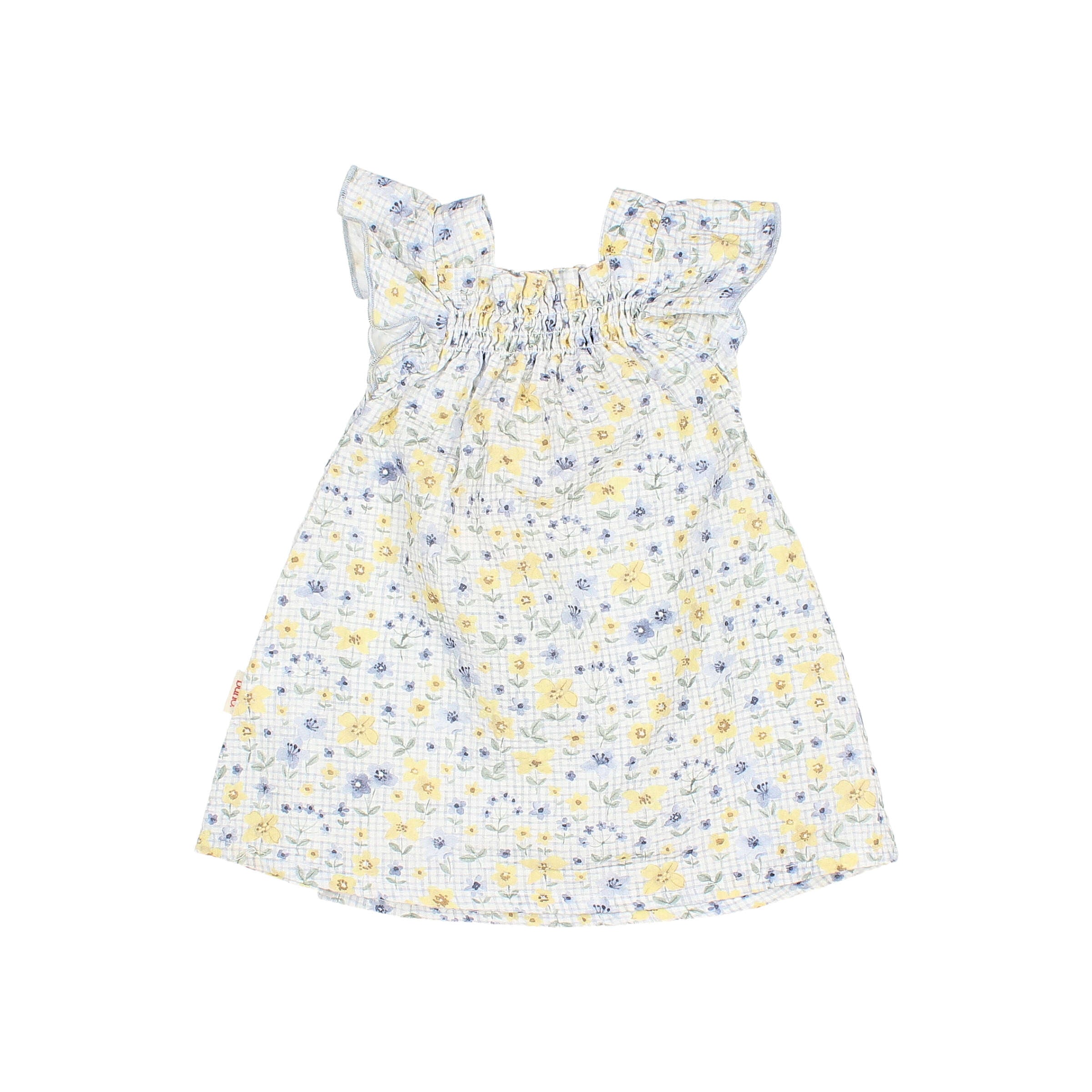 El vestido de la marca Búh Bcn presenta un estampado floral delicado sobre fondo claro, con flores pequeñas en tonos amarillos suaves, azul empolvado y verde tenue, que crean un conjunto fresco y muy armonioso. El tejido es ideal para los días cálidos.