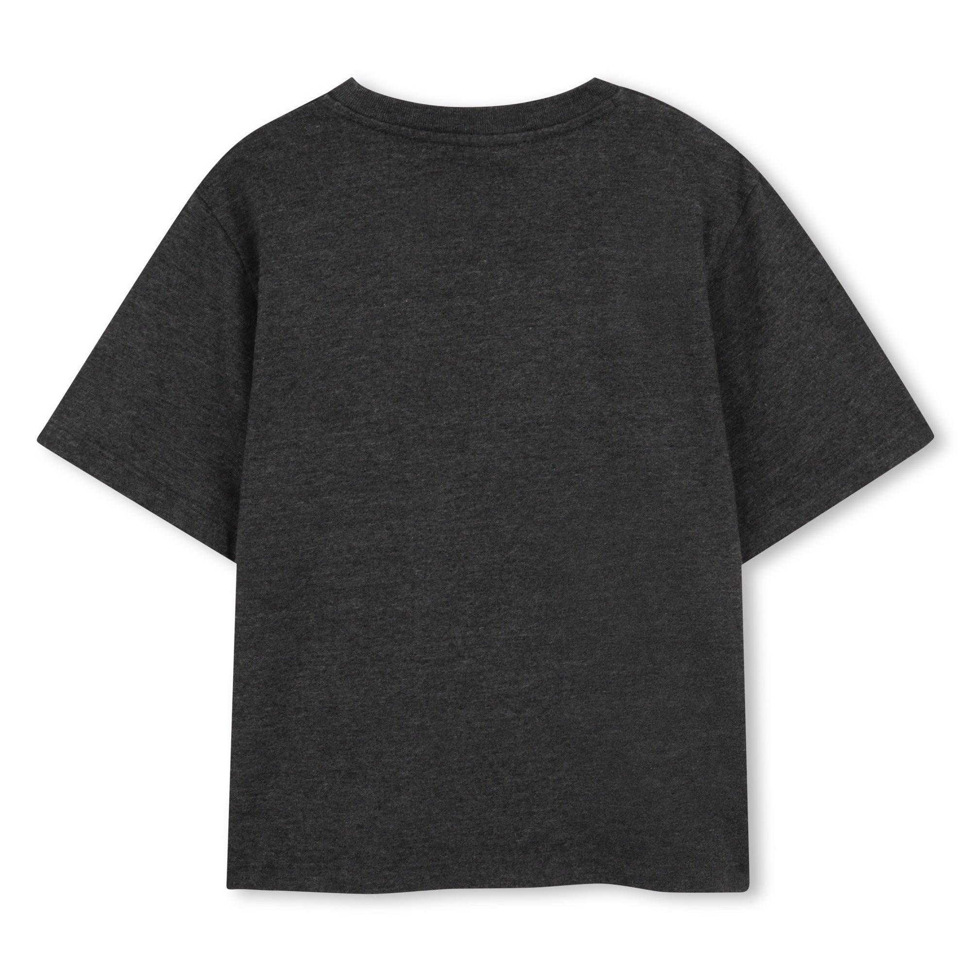 Tiene cuello redondo clásico y corte recto, con un estilo cómodo y ligeramente relajado. La parte trasera es lisa, sin estampado, manteniendo el acabado en gris oscuro jaspeado. Es una camiseta con personalidad, ideal para looks casuales con un toque rock y desenfadado.
