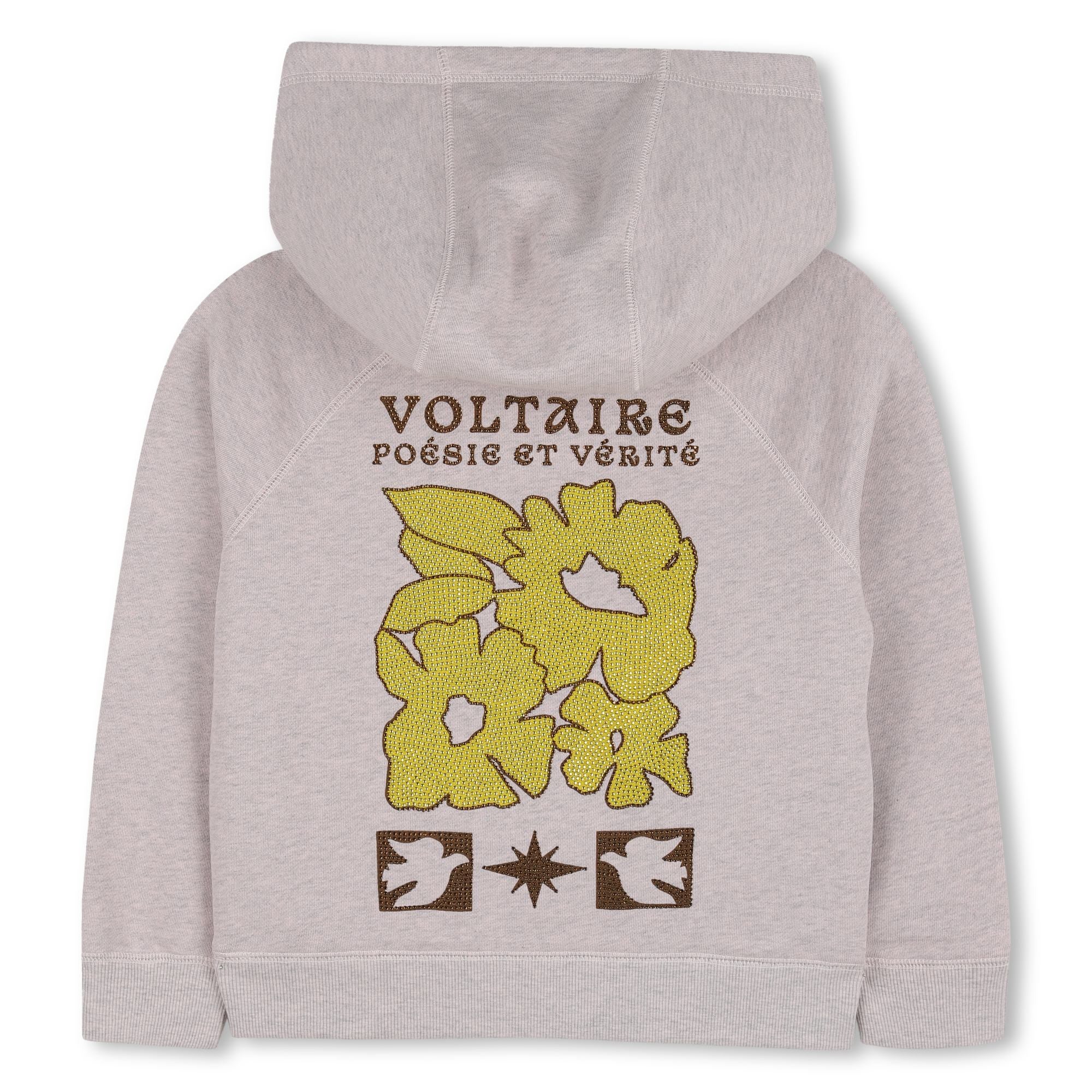 La parte trasera es la protagonista del diseño: incluye un gran estampado decorativo con el texto “Voltaire Poésie et Vérité” en la parte superior. Debajo, destaca un llamativo motivo floral de gran tamaño, acompañado de elementos gráficos como estrellas y aves enmarcadas, creando una composición artística y muy característica de la marca.