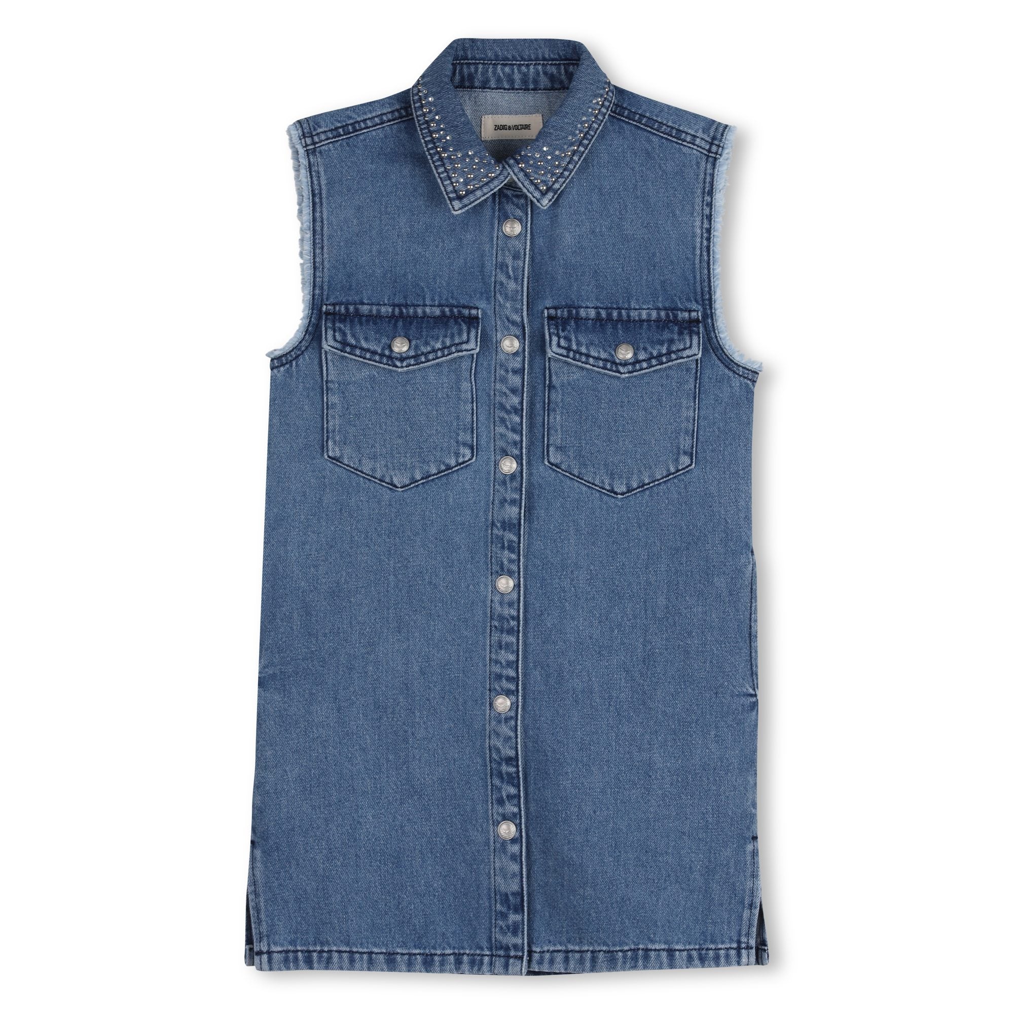 Es un vestido camisero de denim con un estilo moderno y desenfadado.