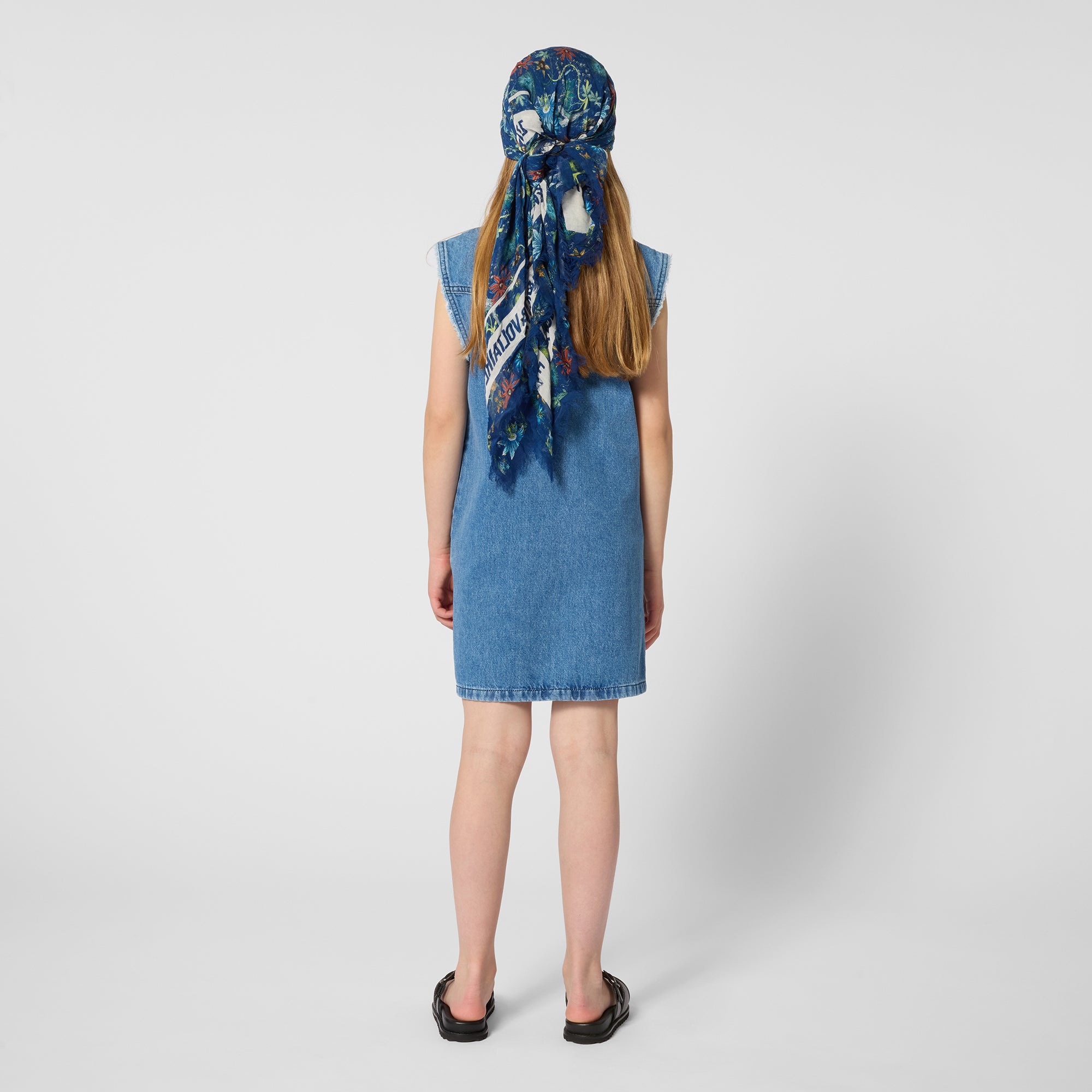 Está confeccionado en tejido vaquero azul medio con ligero efecto lavado, lo que le aporta un acabado casual. Presenta corte recto y largo por encima de la rodilla.